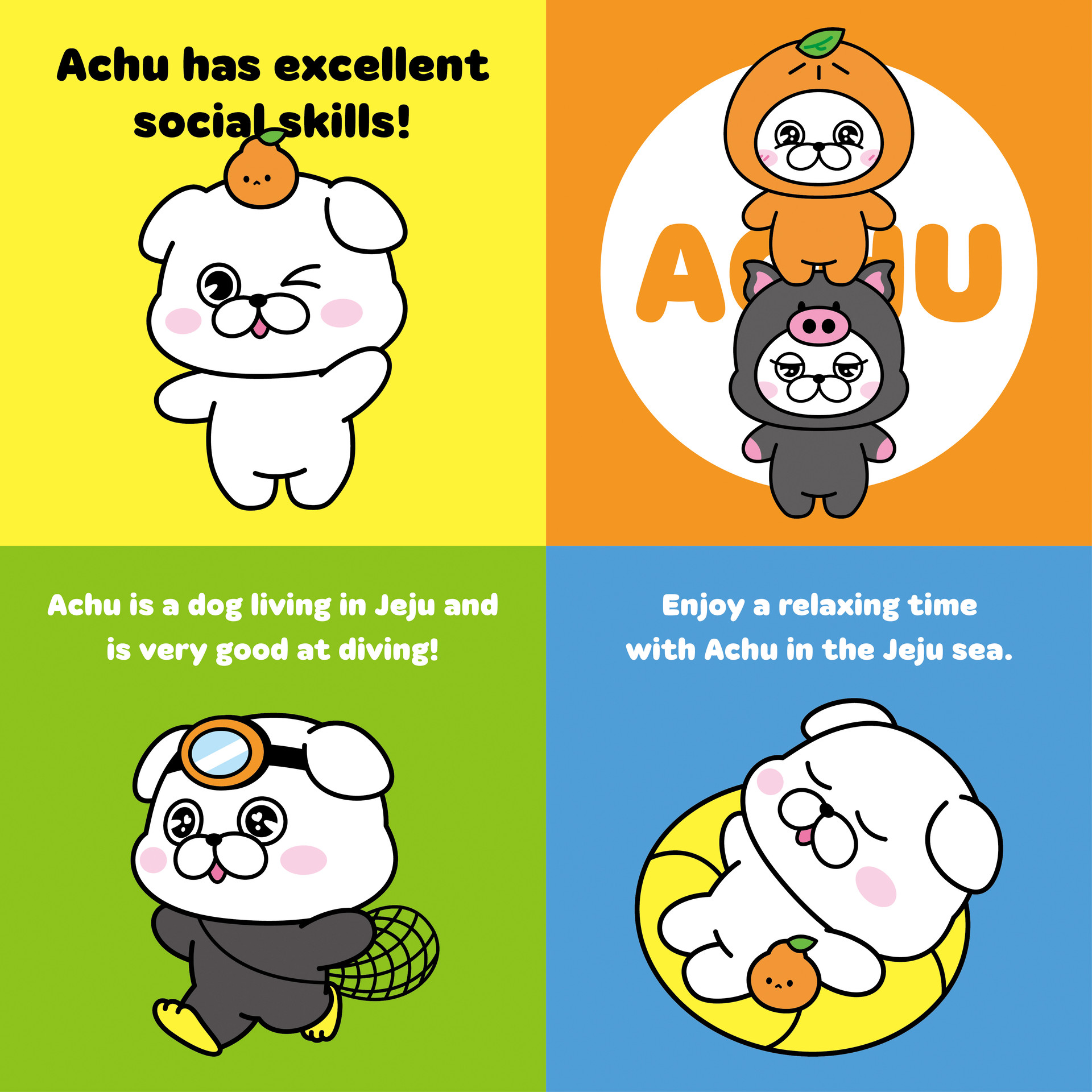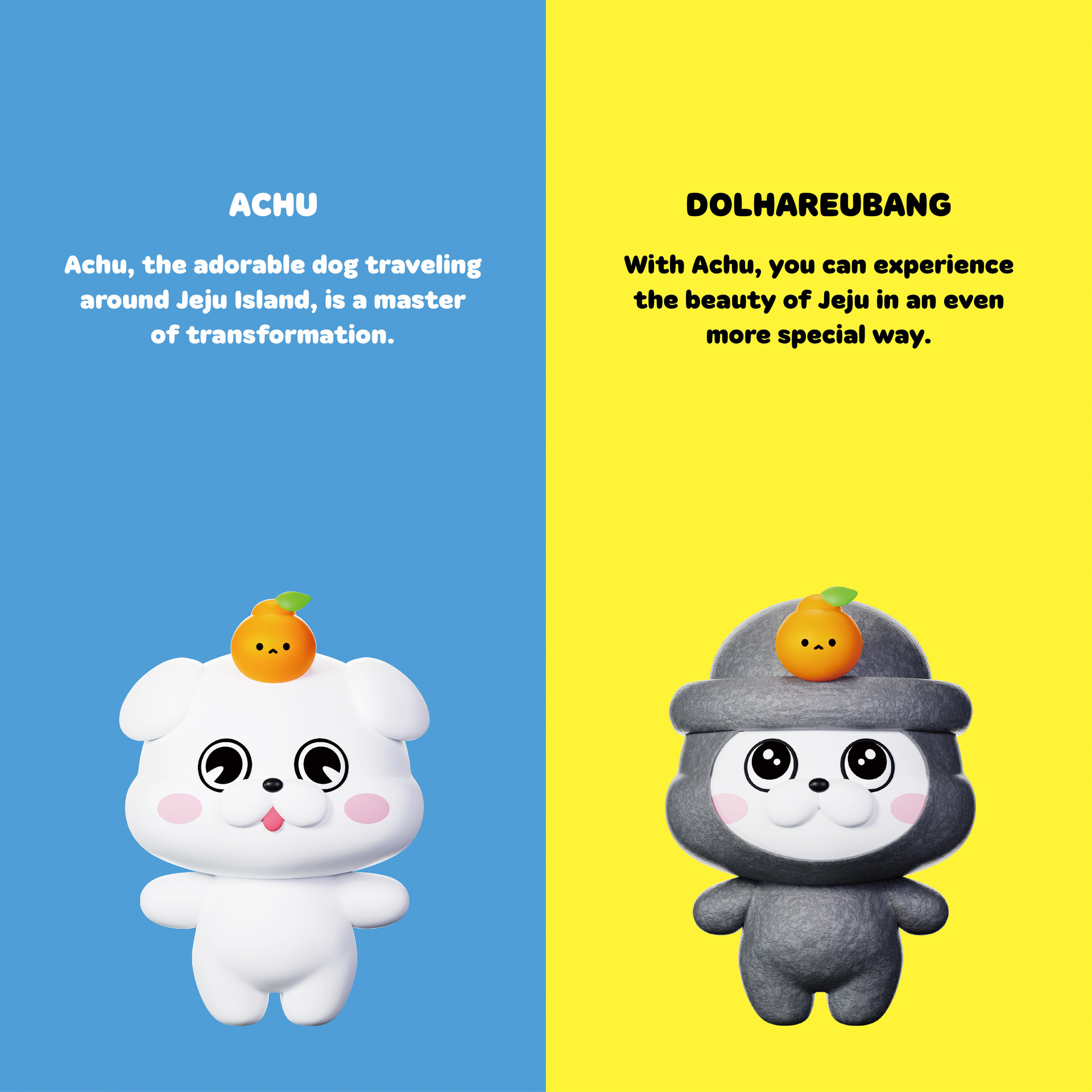 제주도를 여행하는 사랑스러운 강아지 아츄는 변신의 귀재입니다. 제주도를 너무나 사랑해서 제주의 명물로 변신하는 마법 같은 재주를 가지고 있죠! 아츄와 함께라면 제주의 아름다움을 더욱 특별하게 경험하실 수 있을 거예요.