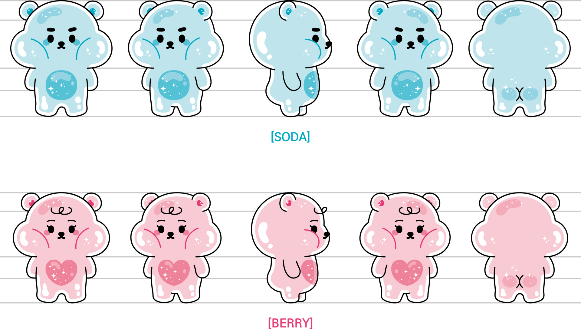 불투명 통통한 몸매의 소유자 소다와 베리는 낙천적이고 활발한 성격을 지니고 있다. 커플이기에 둘이 같이 놀러 다니는 걸 좋아하며 다양한 취미를 지니고 있다. 가끔 장난이 짓궂어 젤리 봉지에 숨어 사람들을 놀라게 한다.