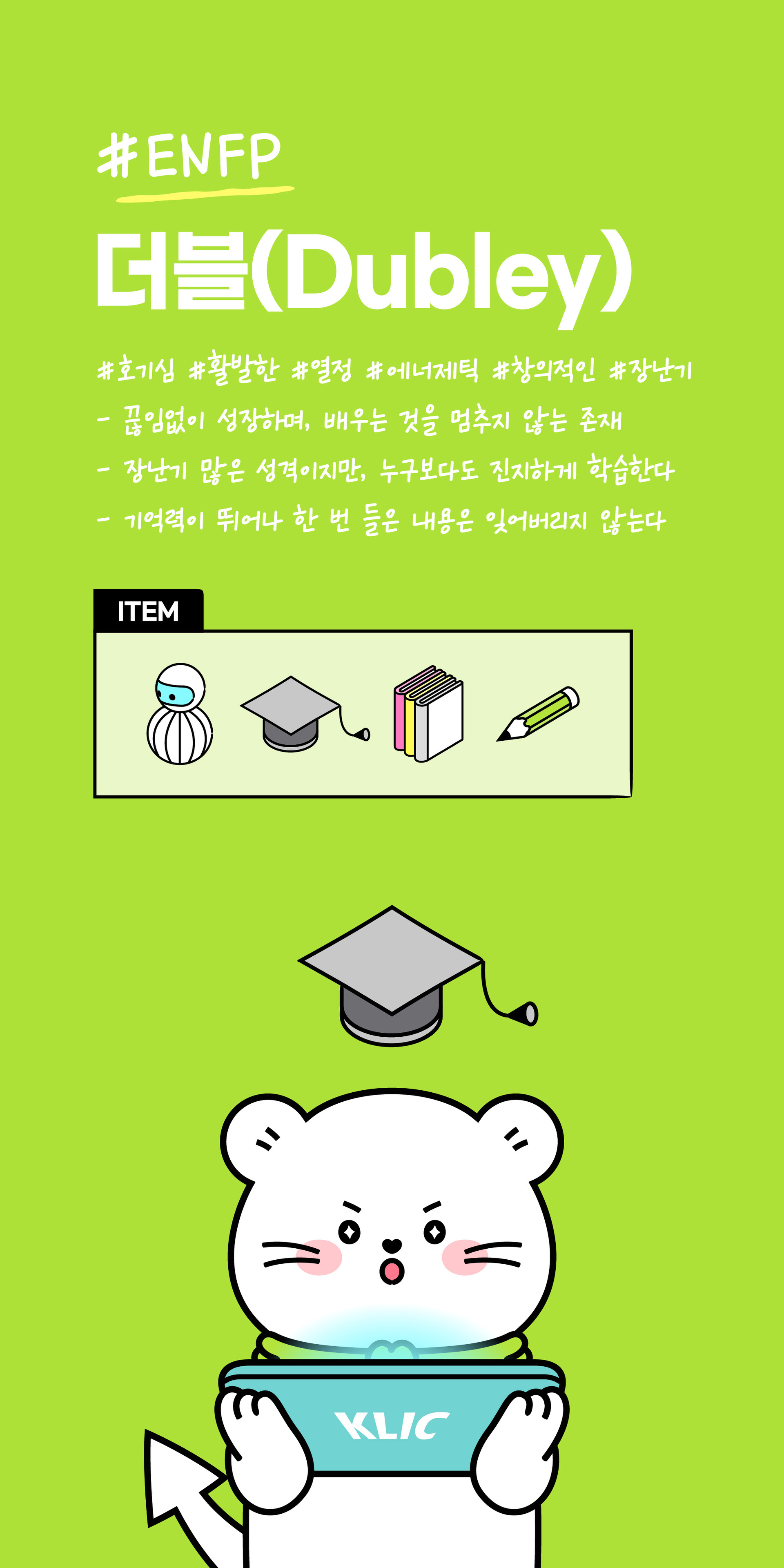클릭키는 디지털 교육을 쉽고 빠르게 이해할 수 있도록 돕는, 친근하면서도 포용성과 다양성을 존중하는 미래지향적인 지도자입니다. 그는 단순히 정보를 전달하는 것을 넘어, 학습자들이 스스로 사고하고 탐구할 수 있도록 이끄는 것을 가장 중요한 역할로 여깁니다. 더블은 열정과 노력을 쏟으며 끊임없이 배우고 성장하는 캐릭터입니다. 클릭키의 조언을 바탕으로 학습을 이어가며, 궁금한 점이 생길 때마다 하루에도 수십 번씩 질문을 던지는 호기심 넘치는 학습자 입니다. 그들의 이야기는 디지털 교육이 어떻게 변화하고 혁신될 수 있는지를 보여주는 미래지향적인 여정이 됩니다.